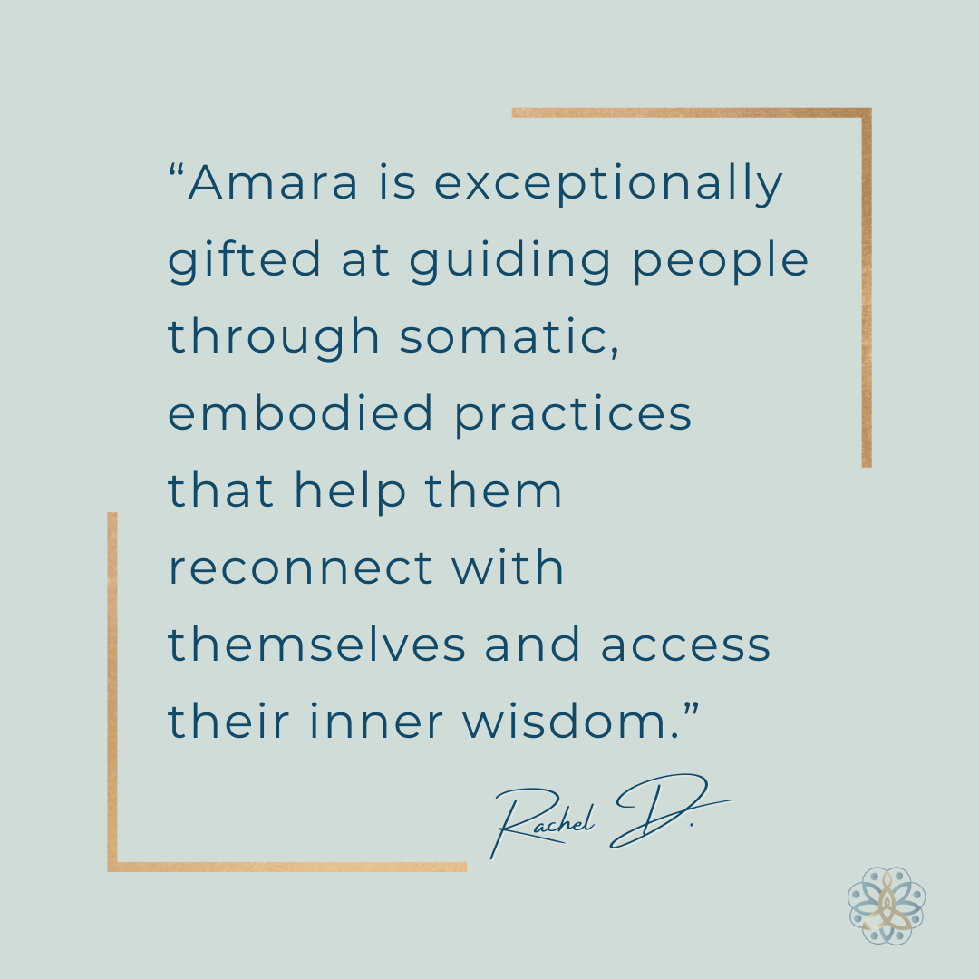 She brings a sensitive, intuitive, and instinctive approach that is both deeply supportive and empowering, inspiring a strong sense of agency and authorship to my own story. Amara is exceptionally gifted at guiding people through somatic, embodied practices that help them reconnect with themselves and access their inner wisdom. She is truly a gift, and her work is worth every single penny. I cannot recommend her more highly!”